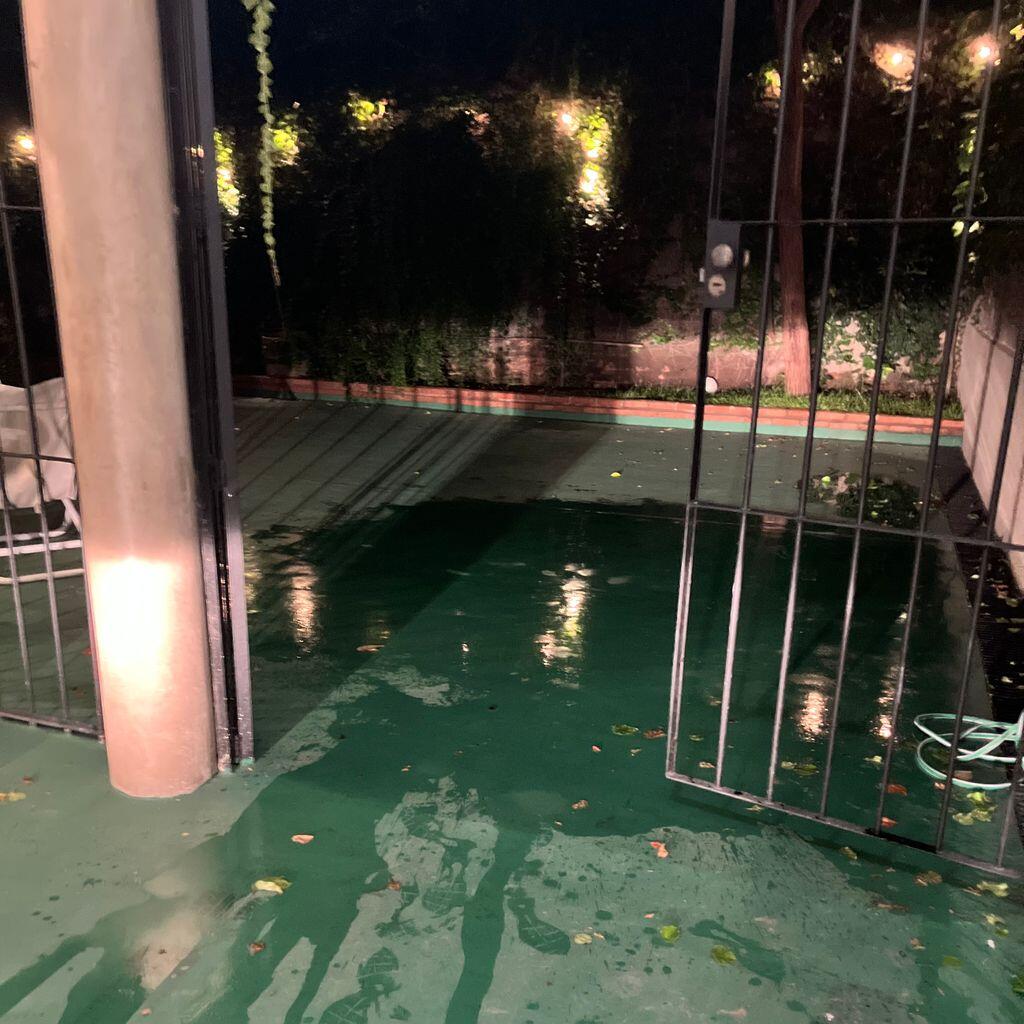 En la semi oscuridad, me costó encontrar la manguera del patio. Cuando la encontré, apreté el dedo sobre el pico para que el chorro saliera con presión. Tenía unos 15 metros, así que el agua que salía al principio estaba caliente, tras varios días de una ola de calor. Apunté al centro del charco y se expandió hacía afuera, dejando un círculo más pequeño y limpio en el centro. Luego el agua empezó a salir más fresca. Tomé un sorbo y me mojé la nuca. Empecé a rodear el círculo con el chorro apuntando hacia el desagüe que está a dos metros del punto en el que impactó la cabeza del caído.